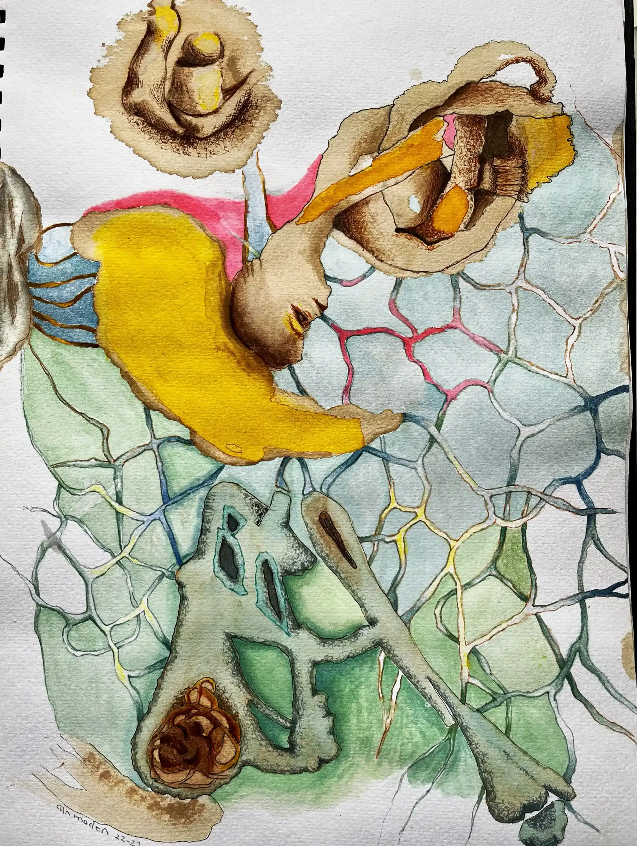 The work on display is rooted in a practice that moves freely between mixed-media art and more focused explorations in watercolor and ink. Layers of collage and scanned textures meet painterly washes and hand-drawn marks, while occasional experiments in digital art extend the palette and scale of each composition. As an Istanbul artist, the studio practice reflects a dialogue between place and process — city life, memory, and material histories inform surface treatments and compositional choices.